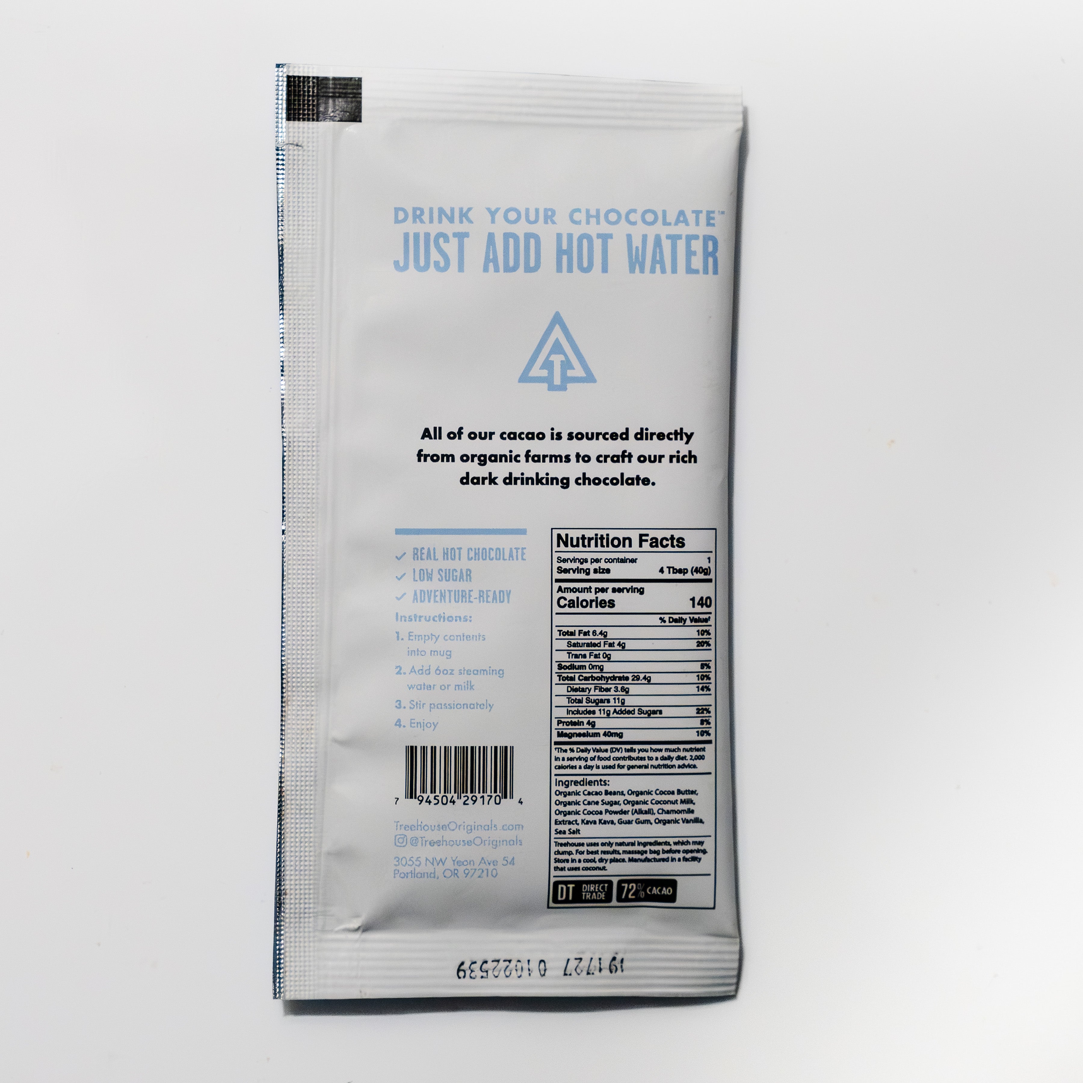 °Cacao Beans, °Cocoa Butter, °Unrefined Cane Sugar, °Coconut Milk, °Cocoa Powder (Alkali), °Chamomile, °Kava Kava, Guar Gum, Passionflower, °Vanilla, Sea Salt